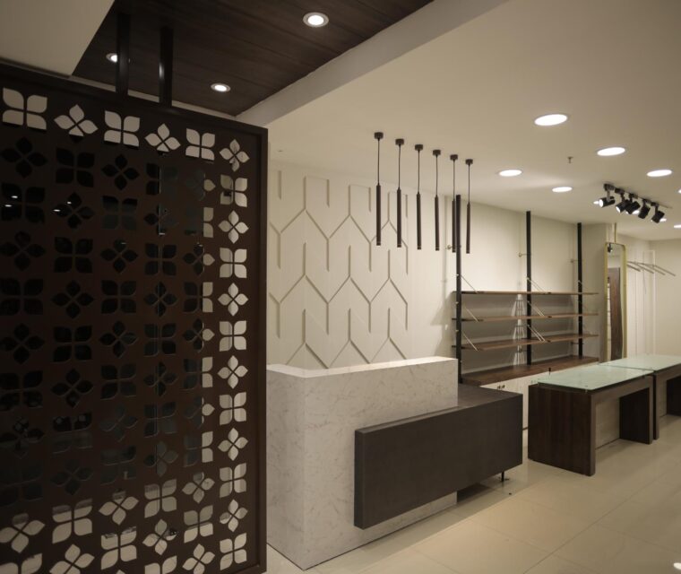 What began as an open layout is now two harmonious worlds—a showroom and the service area. The serene showroom displays both unstitched fabrics and finished garments along with a carefully planned fit-out room and changing area.Behind the scenes, the hidden service zones handling stitching, alterations, and embroidery with quiet efficiency.