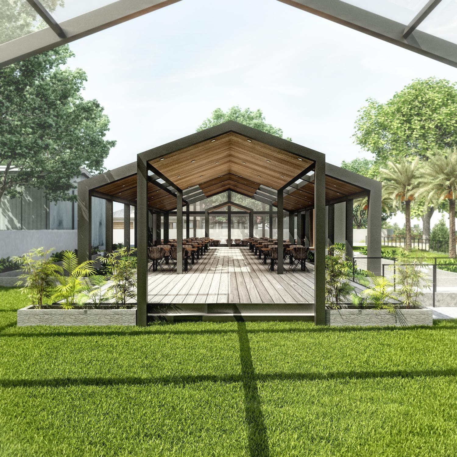A blend of neo-vernacular and contemporary styles created cohesive additions - including a scenic riverside restaurant, indoor café, and open-air event space - while respecting the original hall's architecture.